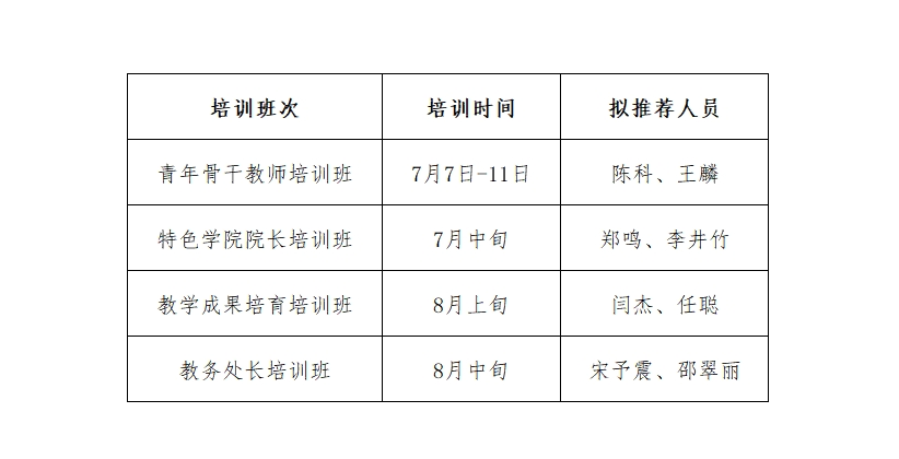 根据《河南省教育厅办公室关于组织实施2025年本科高校教师省级示范性培训的通知》(教高函〔2025〕341号)文件精神,经会议研究,报学校审批,拟推荐陈科等8名教师参加2025年本科高校教师省级示范性培训,现将名单公示如下: